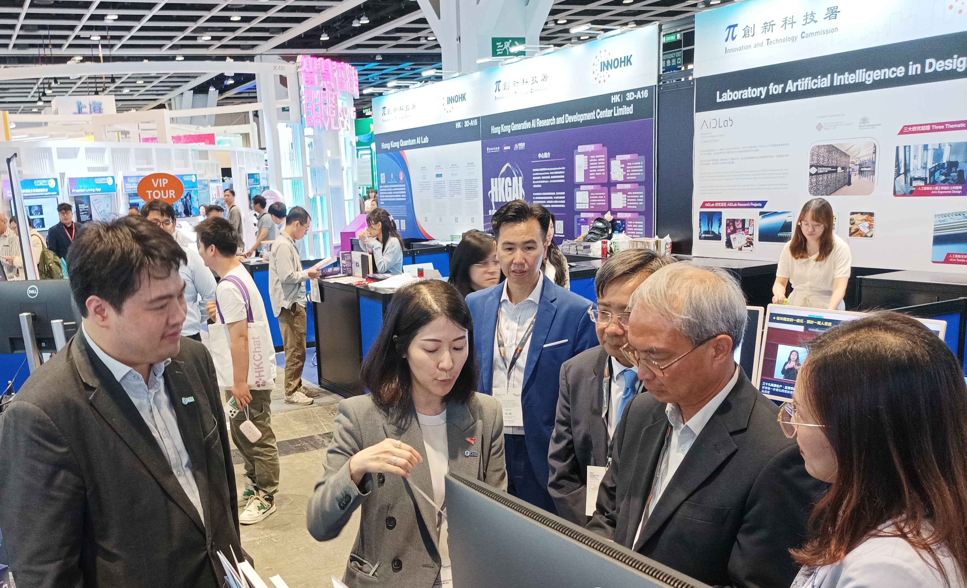 Prof. Sun Dong, Secretary for Innovation, Technology and Industry, Mr. Ivan Lee, Commissioner for Innovation & Technology and Mr. Nicholas Kwan, Deputy Head of Chief Executive’s Policy Unit have visited the InnoHK Pavilion and listened to the demonstrations from different InnoHK Centres. Highlights including: the “CPII Real-Time Speech-to-Summary Meeting Assistant”, developed by the Centre for Perceptual and Interactive Intelligence, has been implemented in various events, including the RTHK’s live broadcasts of the Policy Address and the Budget Speech; the Hong Kong Centre for Cerebro-Cardiovascular Health Engineering has led over 30 clinical studies supporting public and community health management, it leveraged its technologies to provide health screening services for more than 14 000 community members, translating research into tangible public benefit.